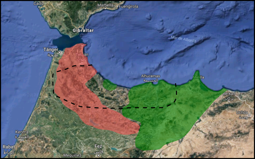 La historia del Rif debe entenderse enmarcada en esta realidad compleja. Así, la región históricamente comprendida como Rif, que iría desde Tánger hasta el río Moulouya, y desde el Mediterráneo hasta el Corredor de Taza, se encuentra dividida en dos realidades étnicas6. La zona oriental, desde Targuist hacia el Moulouya, de naturaleza rifeña y amazigh, se caracteriza por haber mantenido su idioma (Chelja o tarifit) y la identidad tribal y bereber (zona verde en el mapa). Que veamos decenas de banderas amazigh en las manifestaciones se comprende en base a esta aplastante realidad; que observemos como sus manifestantes levantan los tres dedos centrales de la mano, es que expresan su comunidad amazigh: tierra (Akal), palabra (Awal) e identidad (Afgal). La zona occidental, llamada Jebala, es fundamentalmente arabofónica, fruto del movimiento de poblaciones árabes a esa zona como medio para controlar la rica y estratégica Península Tingitana, con grandes ciudades: Tánger, Tetouan, Ceuta, Chefchauen o Larache (zona roja en el mapa). En esta tendencia, ciudades históricamente rifeñas, como Ceuta, Melilla, Tánger, Tetouan, han sido sistemáticamente separadas de la región central y de su carácter amazigh, vinculándose a los poderes estatales marroquíes, como forma de controlar los flujos comerciales y la riqueza agrícola de la que disponían. Por su parte, las zonas más montañosas del Rif han quedado marginada económica y políticamente. Será a esta zona central rifeña a la que nos refiramos al hablar del Rif en este artículo.