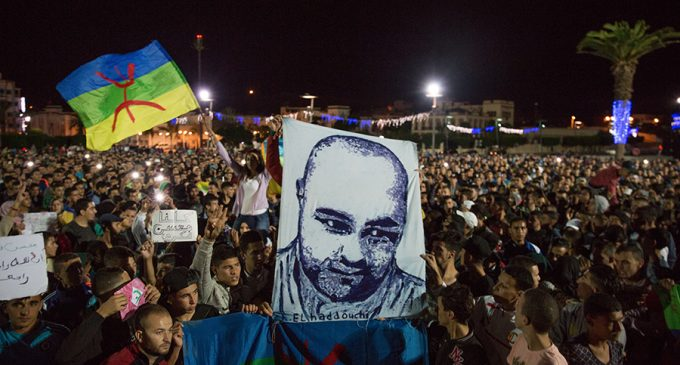 Manifestación en Alhucemas con la imagen del pescador Mouhcine Fikri, cuya muerte fue la chispa de las protestas. En segundo plano, una bandera amazigh (Fuente).