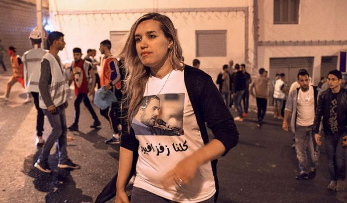 Nawal Ben Aisa, nueva cara de las protestas, tras el encarcelamiento de Zefzafi, cuya imagen vemos en su camiseta (Fuente)